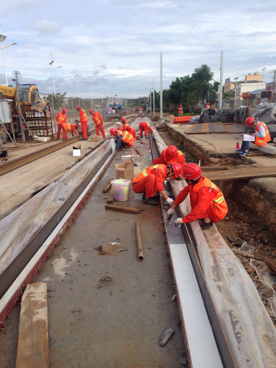 供货合同确定以后,轨道工程公司领导迅速组织技术、质量、供应、工程等相关部门就线路应用方案进行专题研究,人、机、料、法、测全部准备到位,2016年7月1日开始配合安装公司进行安装。截止到7月12日上午,雨过铺左、右线各100米嵌入式轨道系统钢制承轨槽已全部安装完毕,目前正在通过监理验收。同时,已顺利完成高分子A、B料的取样工作,并开始右线混凝土浇筑。