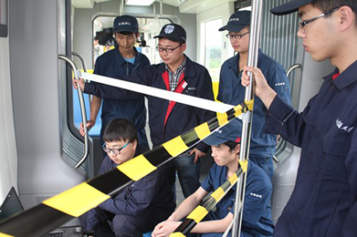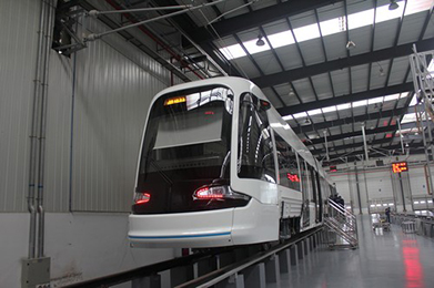 由新筑股份公司和中国北车长春轨道客车股份有限公司共同合资打造的轨道交通装备生产基地位于成都天府新区。走进生产基地,宽敞的厂区道路旁坐落着一排排崭新的车间,分别是现代有轨电车的总装总调车间、车体和转向架制造车间与表面处理车间。经过车间,来到生产基地后方的动态调试线,一辆外型时髦美观的现代有轨电车正在线上进行调试。这辆用于新津本地R1项目的现代有轨电车车辆于一个月以前已装配完毕并顺利通过静态调试,厂区内的动态调试线也全面建成。该动态调试线全程1.2公里,模拟了城区路面、城郊公路、绿化带线路等多种现代有轨电车行驶路段,可用于检测现代有轨电车、地铁车辆、城际动车等各类轨道交通工具在行驶过程中的安全性能、舒适度、噪声控制、平稳度等参数。