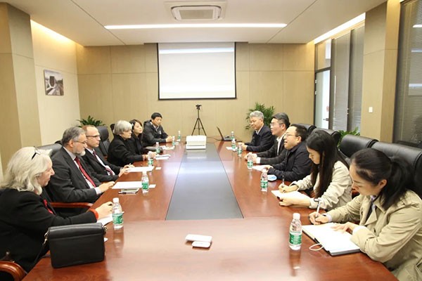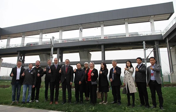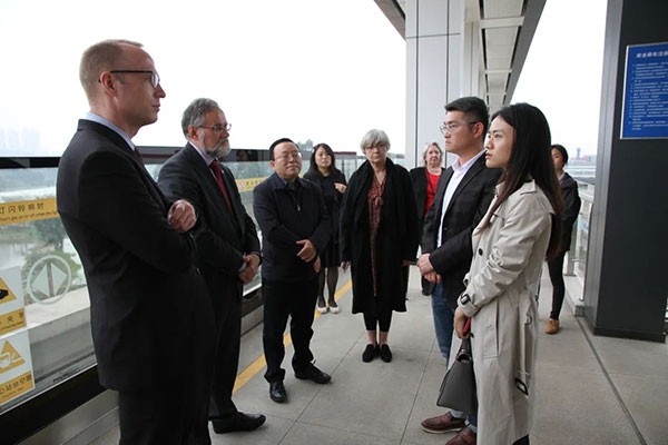 在四川发展(控股)有限责任公司对外合作部副总经理赵亦周女士和新筑股份党委书记、董事长肖光辉先生的陪同下,白瀚德参赞先生一行参观了新筑股份内嵌式中低速磁浮综合试验基地。双方在综合试验基地会议室进行了友好交流座谈。