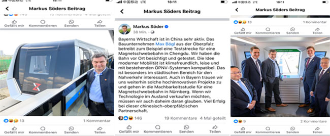 巴伐利亚州的经济在中国十分活跃。例如上普法尔茨行政区的建筑企业Max Bögl集团在成都运作着一条磁悬浮试验线。我们去往现场参观并且进行了试乘。这一创新的“移动”理念对气候友好、运行安静、能与当前的城市公共短途交通兼容,特别作为城市内部的短途交通系统令人十分感兴趣。在巴伐利亚州我们也信赖这些先进创新项目,正在对纽伦堡计划修建的一条磁浮轨道交通线路开展可行性研究。如果我们希望将技术出口至国外,那么我们必须在家里先信赖这项技术。祝这份中国-上普法尔茨行政区的伙伴关系取得成功!